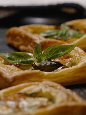 4. Add the basil leaves and a splash of olive oil and mix together. Pile a little of the vegetable mixture on each pesto-smeared tartlet