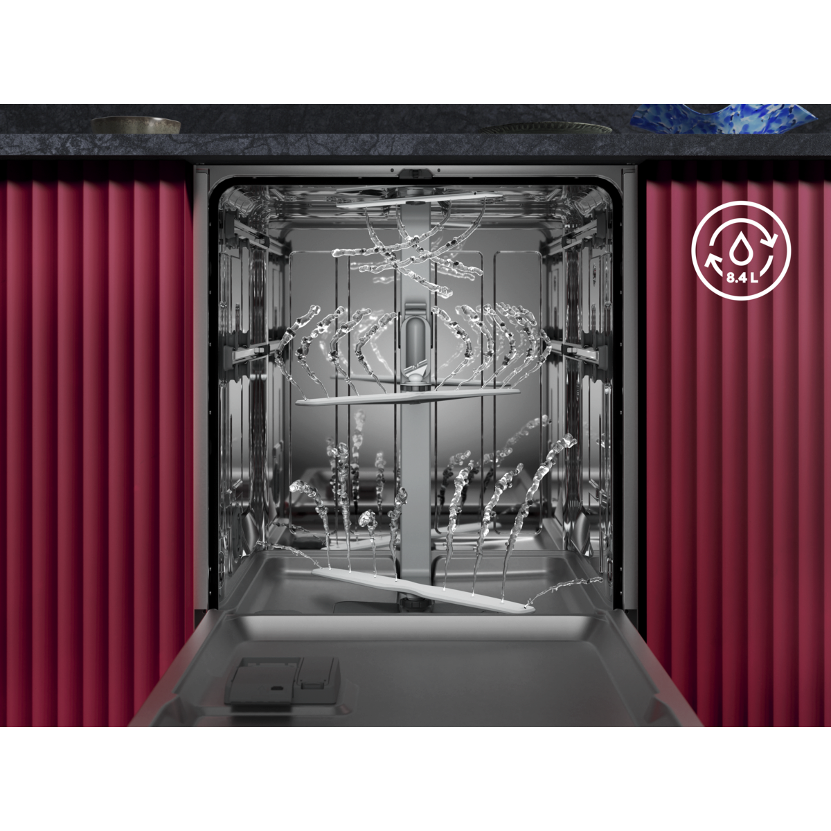 7000 XXL: 5cm taller inside yet fits a standard kitchen counter. Efficient, effective cleaning, with a re-engineered water system that uses as few as 8.4 litres of water. Spacious, adjustable baskets with foldable sections for easy loading.