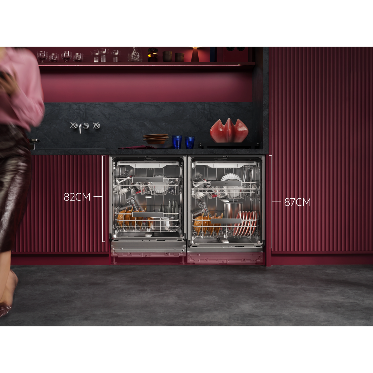 9000 XXL: 5cm taller inside yet fits a standard kitchen counter. Multi-functional baskets with holders for glasses and trays. Powerful cleaning removes baked-on food residues. High-efficiency water system uses as little as 8.4 litres of water.