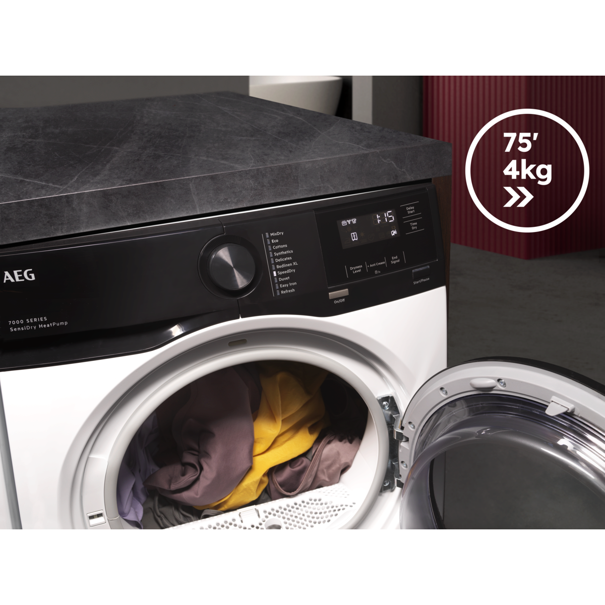 Fast cycle for busy days. Gently dries up to 4 kg in 75 mins.*