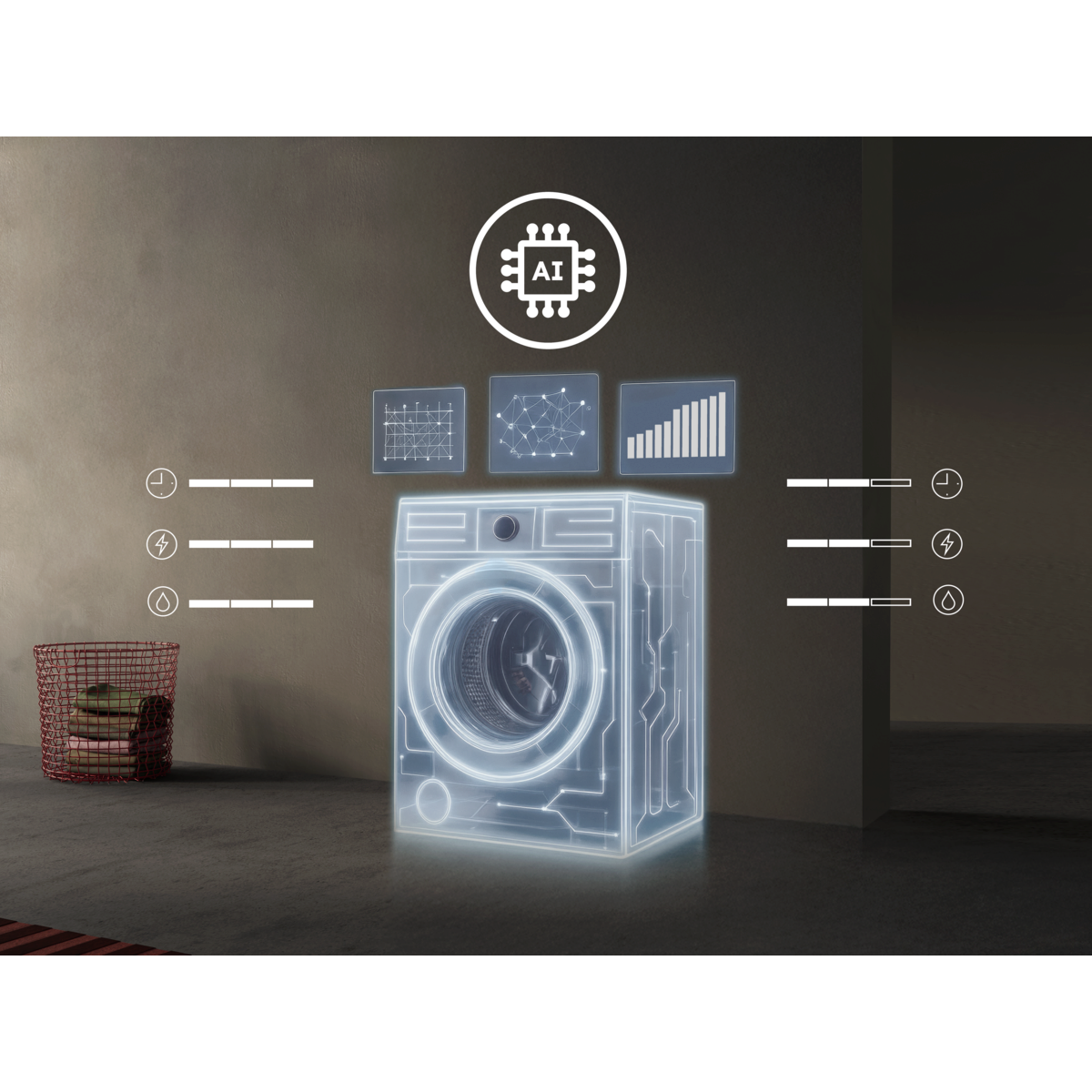 *Based on Load weight detection algorithm that has been pre-trained based on a variety of loads. No user data is used to further train the AI. ** Internal test for time, water and energy consumption of a 30°C Cotton cycle optimized with AI WashAssist for 1kg vs maximum load.